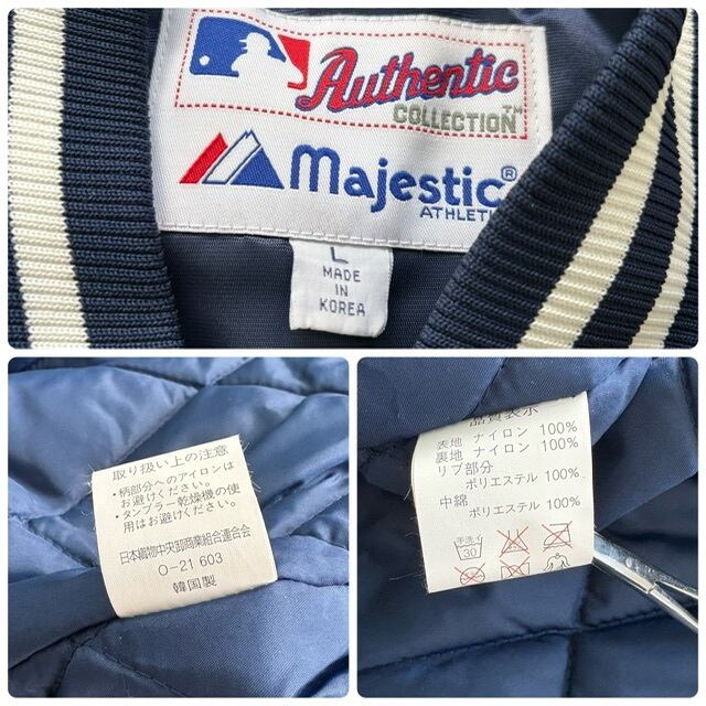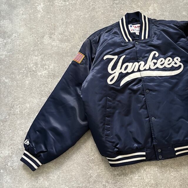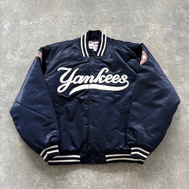 【Majestic】マジェスティック ヤンキース スタジャン スタジアムジャンパー NEW YORK YANKEES 刺繍 ワッペン バーシティジャケット 紺 (L)