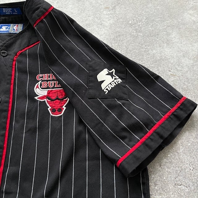 【STARTER】Chicago Bulls スターター シカゴブルズ ベースボールシャツ ゲームシャツ 半袖シャツ ストライプ ワッペン 刺繍 90s ブラック