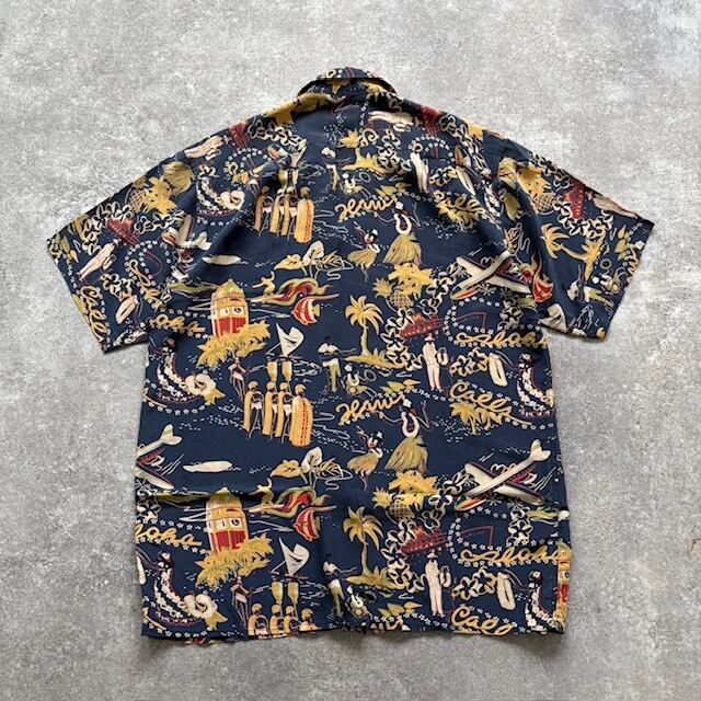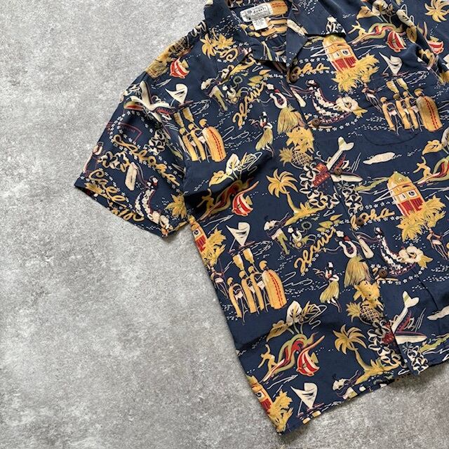 【AVANTI】アバンティ シルク アロハシャツ オープンカラーシャツ ハワイアンシャツ 開襟 ループカラー 総柄 フラガール カメハメハ (L)