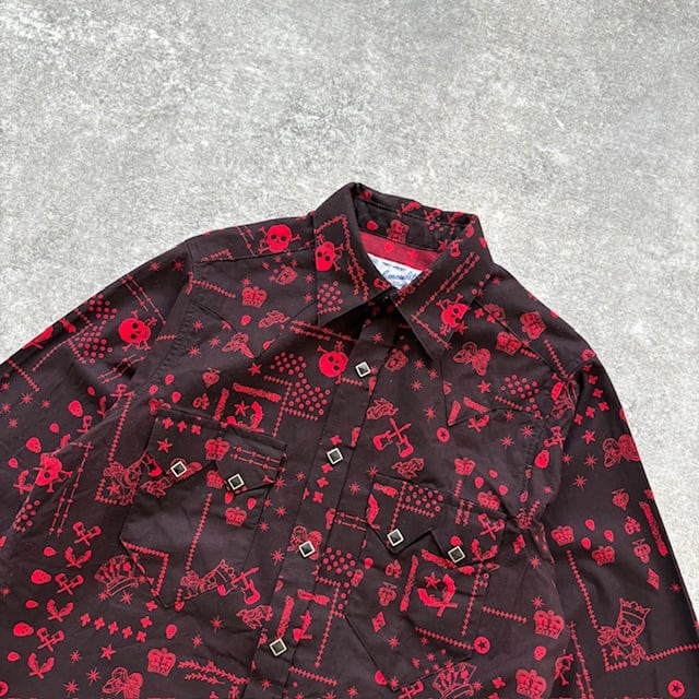 スカル×ギター×クラウン総柄で、唯一無二の個性を放つ一着。王道のウエスタンディテールに、パンチの効いたデザイン。