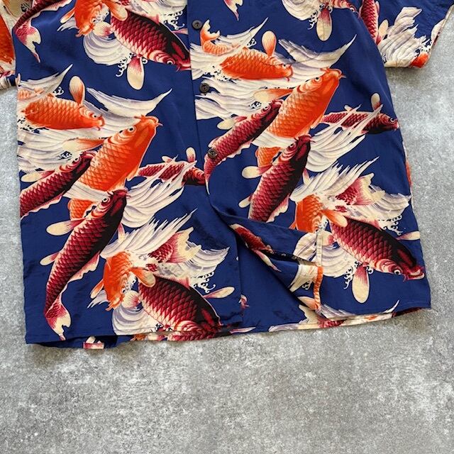 【AVANTI】アバンティ シルクアロハシャツ オープンカラーシャツ ハワイアンシャツ 鯉 総柄 カープ 開襟 ループカラー ドレープ感 (L)