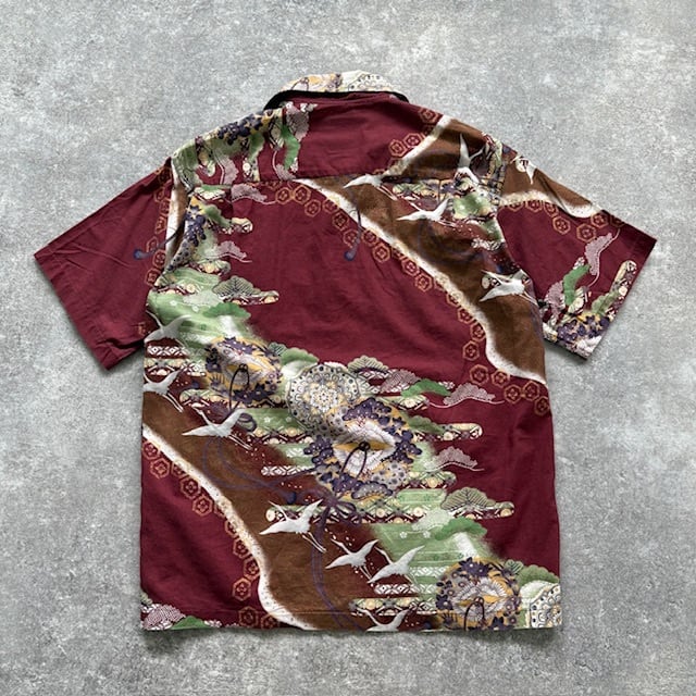 【KAMEHAMEHA】MAKANALEI カメハメハ マカナレイ アロハシャツ オープンカラーシャツ 半袖シャツ ループカラー 鶴 和柄 ボルドー コットン