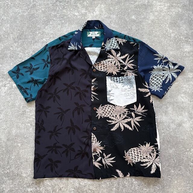 左右非対称の袖や、切り替えの大胆なボディ配色、パイナップル×ヤシの木の絶妙なミックス柄──