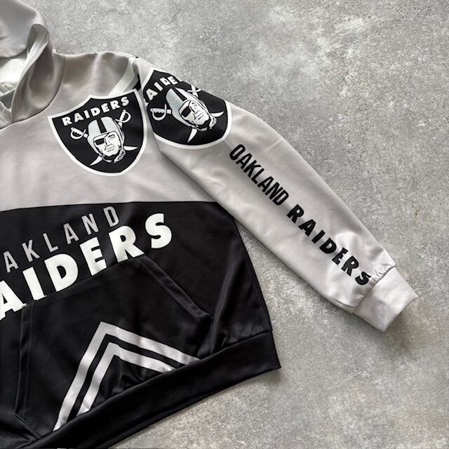 【NFL】RAIDERS レイダース ポリエステルパーカー フルデコプリント フーディー プルオーバー ビッグロゴ オークランド ラスベガス 灰黒