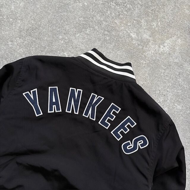 フロントのNYロゴ、バックの“YANKEES”アーチ刺繍が放つ存在感。マットなブラックボディにホワイトのロゴが映え、羽織るだけでコーデが締まる。