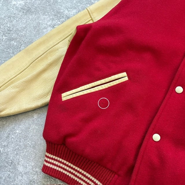 腹部に僅かな小穴があり(写真5枚目)、レザー部に若干の汚れがありますが、ヴィンテージのアジとしてまだまだ着用いただけます。