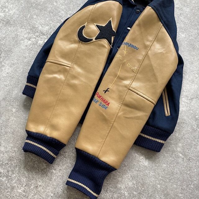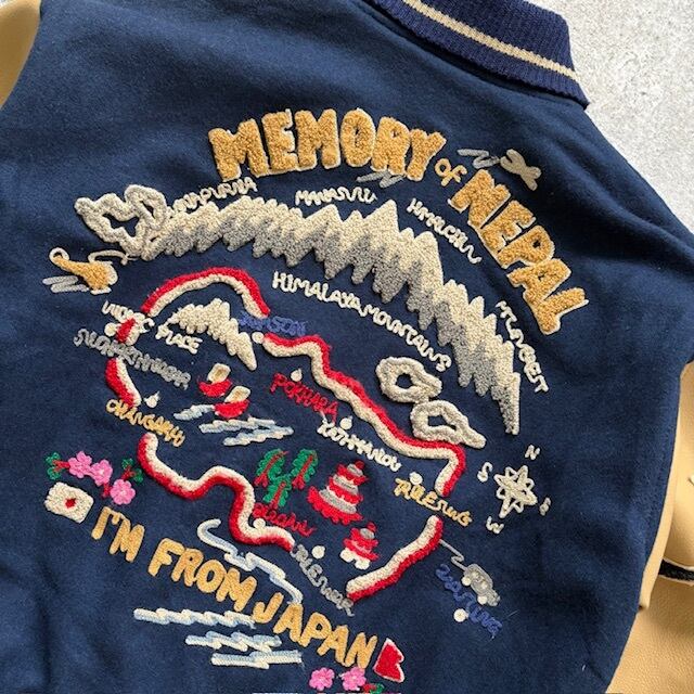 袖にはポカラ湖やカトマンズなどの地名が刺繍され、まるでスーベニアジャケット(スカジャン)のようなストーリー性を持っています。