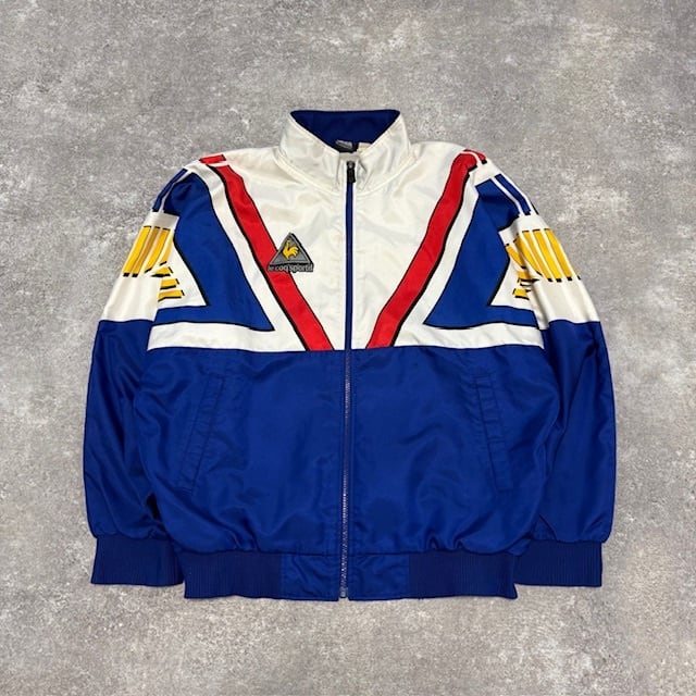 ブランドの象徴であるトリコロールを大胆に落とし込み、バックには立体的な「LE COQ SPORTIF」ロゴと“INTERNATIONAL FRANCE”の刺繍を配した、当時ならではの存在感を放つ一着です。