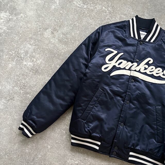 【Majestic】マジェスティック ニューヨークヤンキース スタジャン スタジアムジャンパー 筆記体ロゴ 刺繍 ネイビー 紺 MLB ワッペン (M)