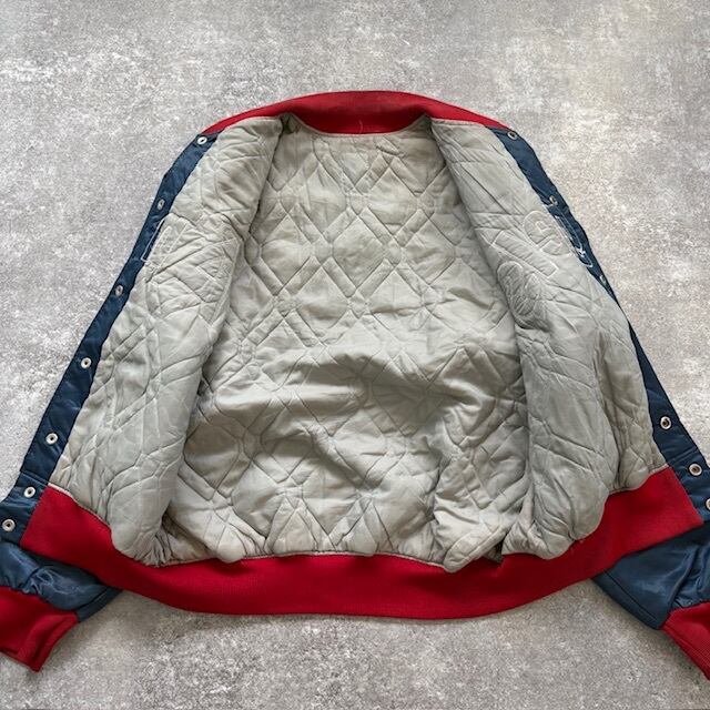 メーカー表記はありませんが、スターターやマジェスティックが盛り上がっていた時代そのままの作りで、裏地のキルティングまで含めて、まさに「80sのスタジャンってこうだったよね」が全部詰まっています。