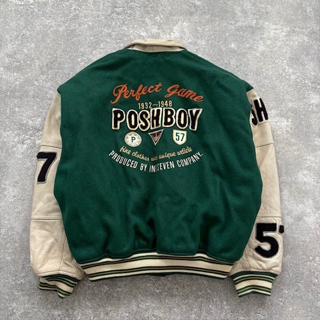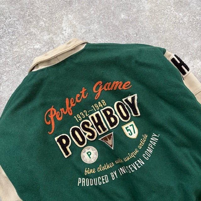 【POSH BOY】80s ポッシュボーイ スタジャン ヴィンテージ 刺繍 バーシティジャケット スタジアムジャンパー 袖レザー 袖革 グリーン (F)