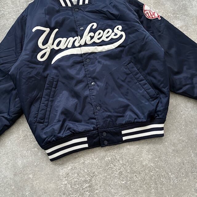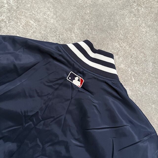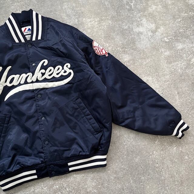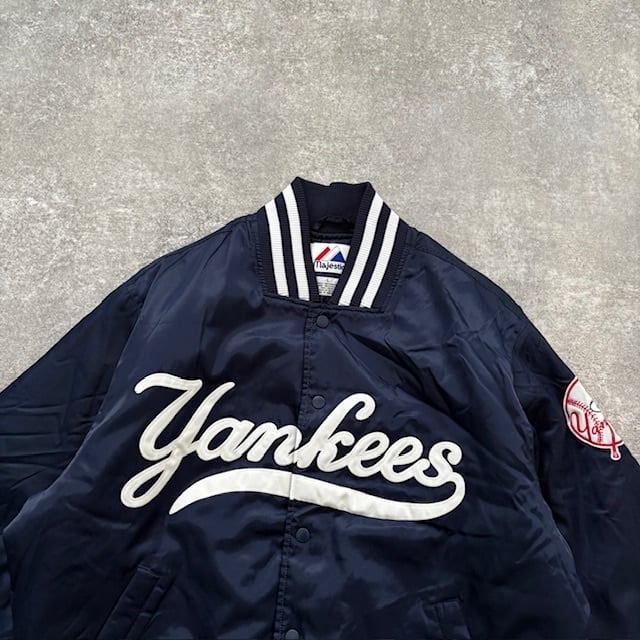 【Majestic】極美品 マジェスティック ニューヨークヤンキース サテンスタジャン 筆記体刺繍 スタジアムジャンパー Yankees ネイビー (L)
