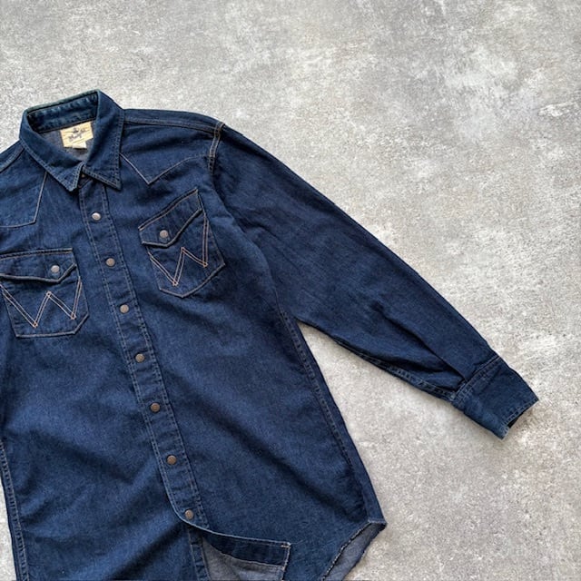 【Wrangler】ラングラージャパン期 27MW デニムウエスタンシャツ 長袖シャツ ヴィンテージ 縦ベルタグ 90s 90年代 濃紺 刻印ボタン (M)