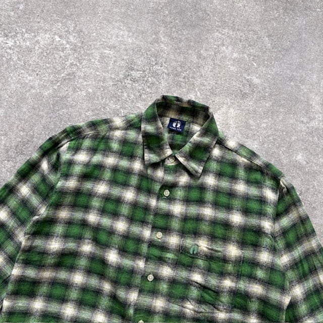 【HANG TEN】ハンテン オンブレチェック フランネルシャツ 刺繍ロゴ ネルシャツ 長袖シャツ シャドーチェック グラデーション 足跡ロゴ (M)