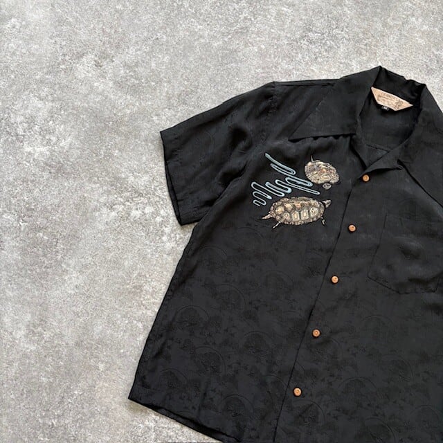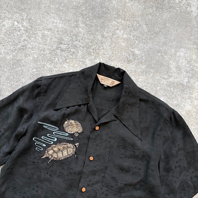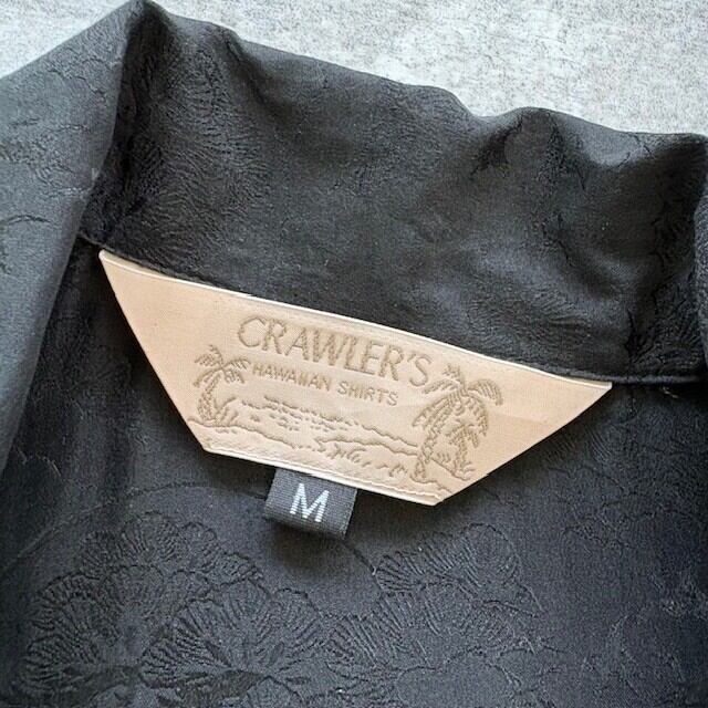 【CRAWLER'S】シルク アロハシャツ オープンカラーシャツ ハワイアンシャツ 半袖シャツ ジャガード織り 和柄 鶴 亀 富士山 刺繍 ブラック