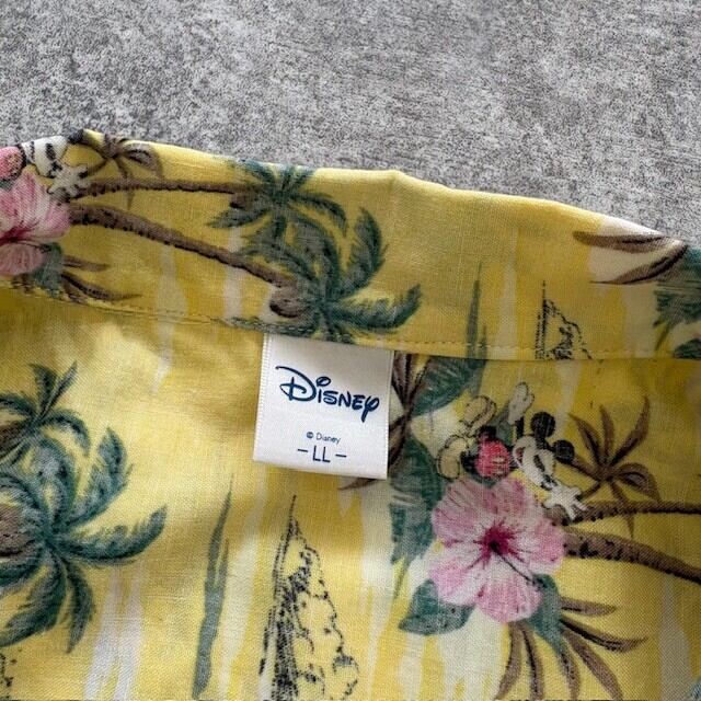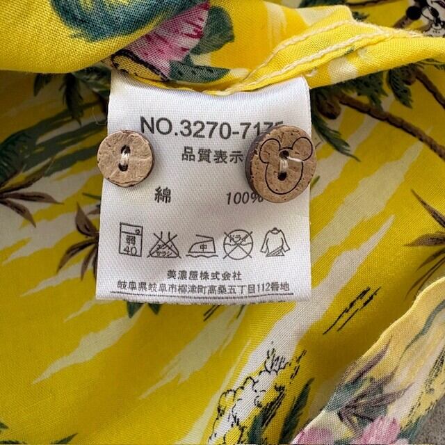 リバースプリントの柔らかい発色に、このイエローの抜けたトーン。南国柄の中に、さりげなくミッキーの気配が潜んでる。