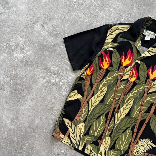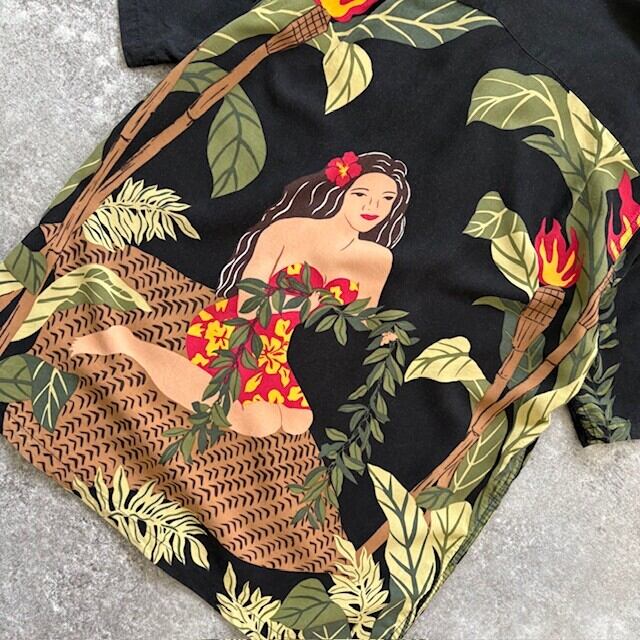 【KAMEHAMEHA】カメハメハ アロハシャツ バックパネルパターン レーヨン ブラック ハワイアンシャツ オープンカラーシャツ フラガール 黒