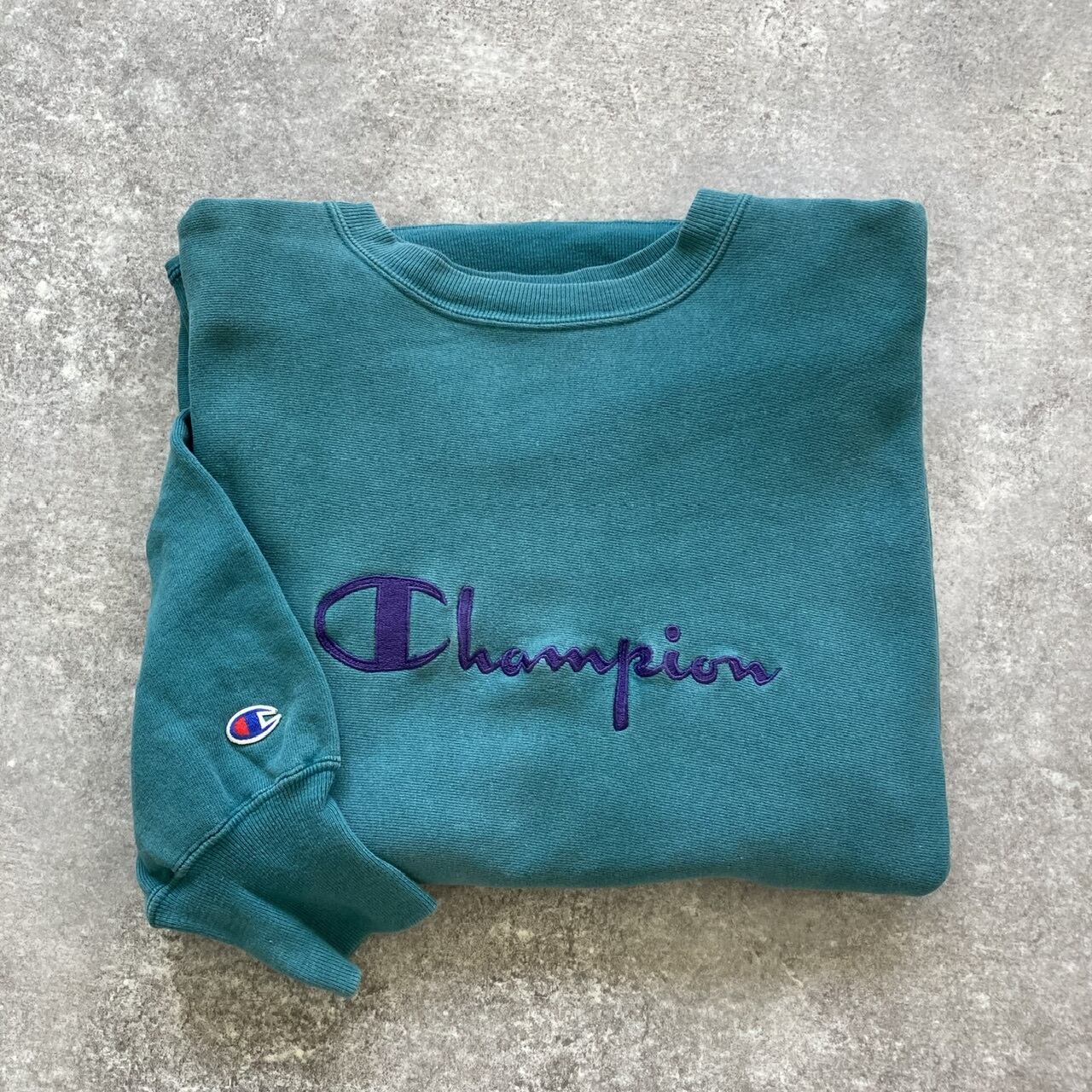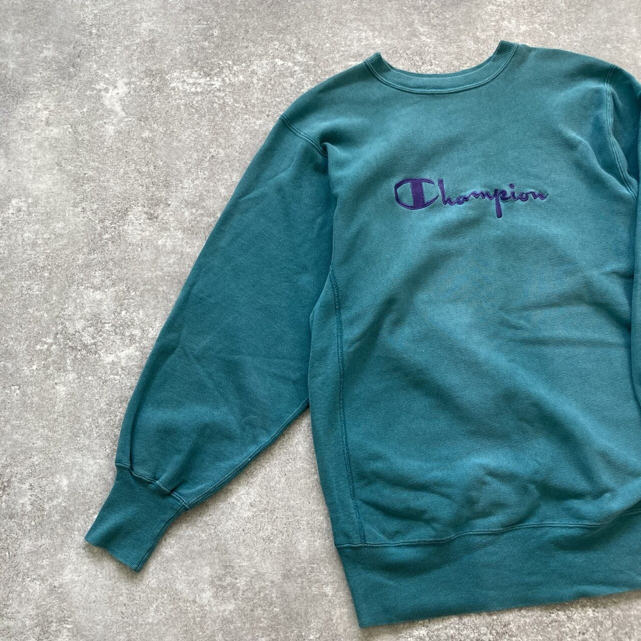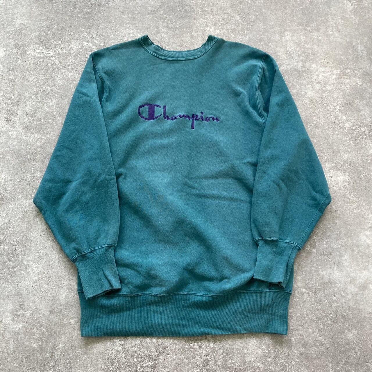 センタースクリプト刺繍ロゴに、フェードグリーンが雰囲気の90年代ヴィンテージアメリカ製。