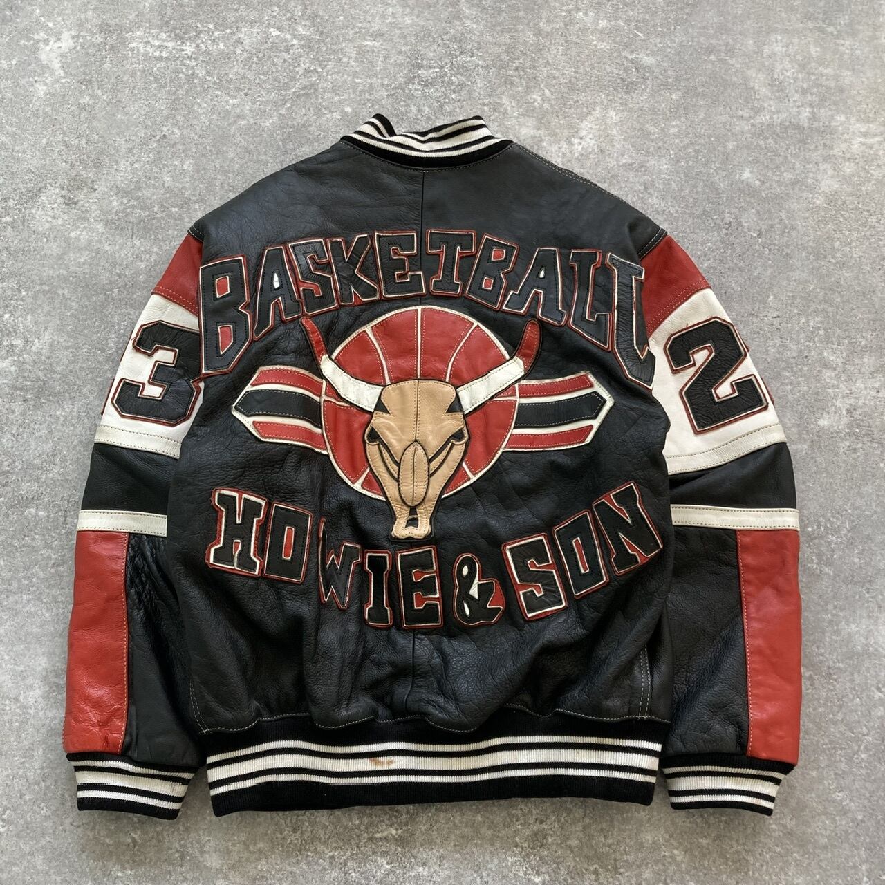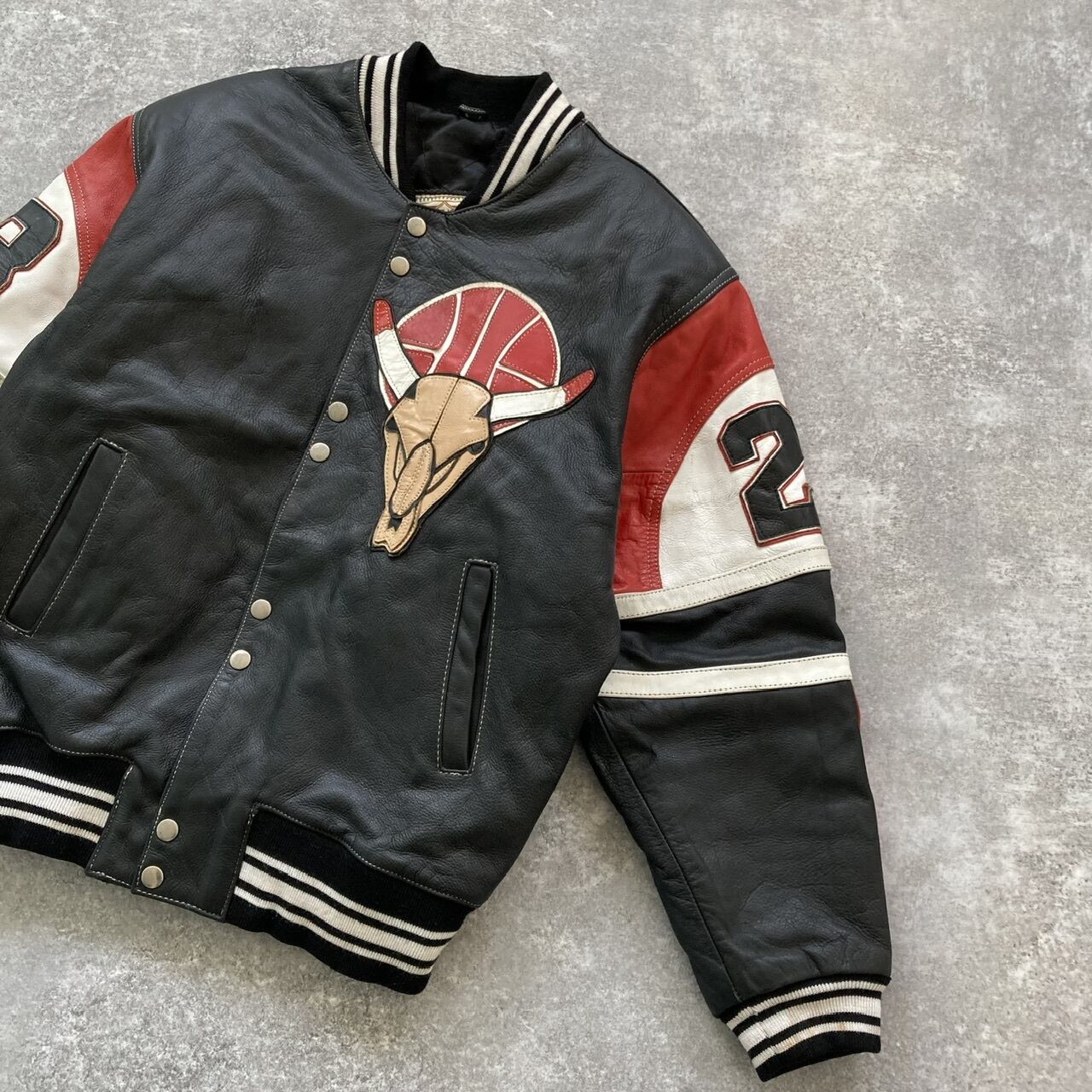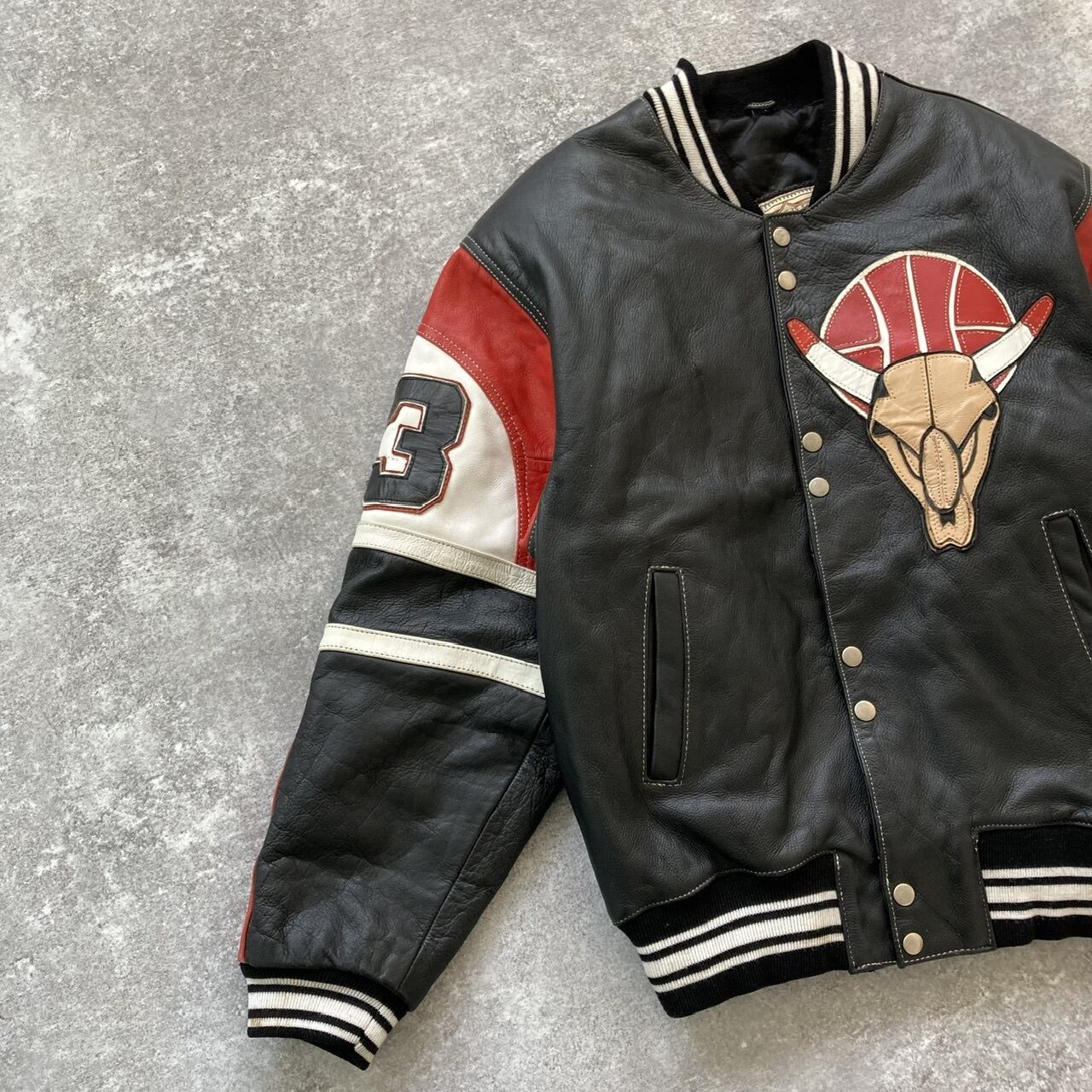 シカゴブルズをオマージュしたようなフルレザースタジャン。