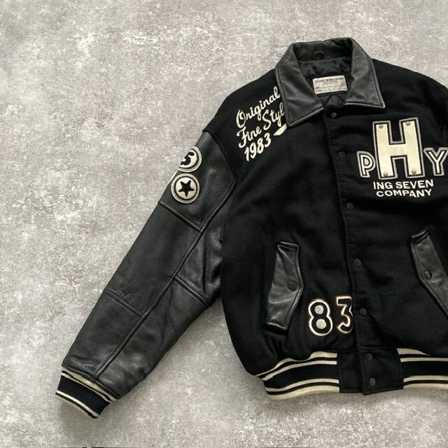 ワッペンと刺繍のデコレーションを、程よいバランスで味付けした、重厚な本革レザー袖のスタジアムジャンパーです。