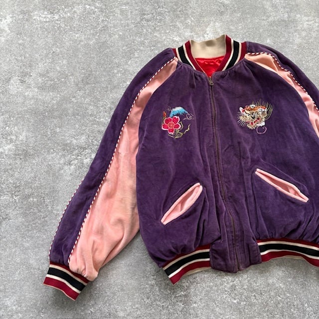 【Vintage】60s 70s ヴィンテージ ベロアスカジャン 別珍 スーベニアジャケット サテン リバーシブル 刺繍 龍 富士山 鯉 和柄 横須賀