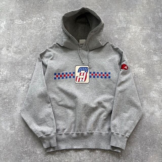 【adidas】アディダス スウェットパーカー フーディ ハーレーモチーフ パフォーマンスロゴ 刺繍 万国タグ 星条旗 00s Y2K アーカイブ (L)