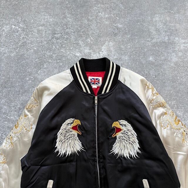 【LONDON F.B.】80s 80年代 ヴィンテージ サテンスカジャン スーベニアジャケット キルティング裏地 龍鷲 刺繍 袖刺繍 ブラック 黒 日本製